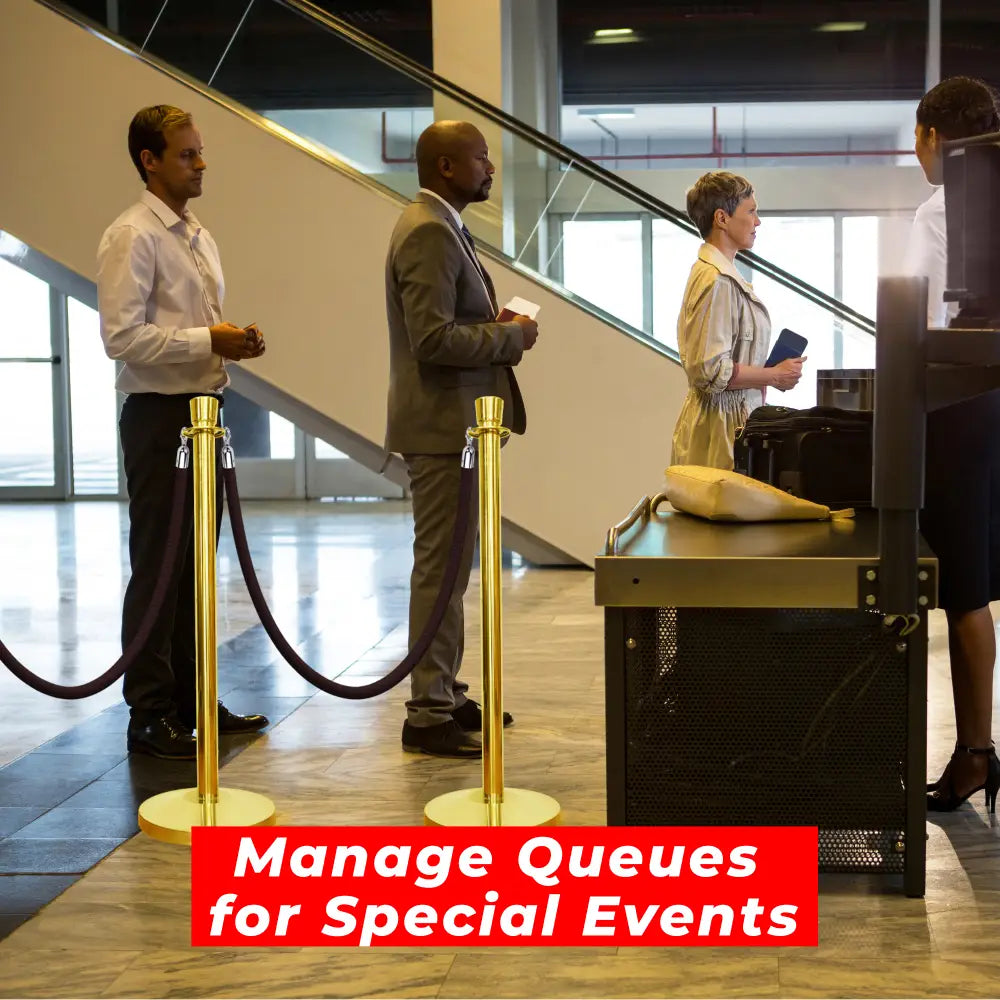 Premium Gold Crowd Control Stanchions with black velvet rope combine strength, elegance, and reliable crowd management. Crafted from high-quality 201 stainless steel with a polished gold finish, each 100 cm post offers excellent resistance to wear and corrosion. The black rope adds a timeless, professional appearance while guiding guests smoothly. A heavy weighted base with rubber protection ensures stability without damaging floors. Perfect for hotels, museums, casinos, exhibitions, theaters, and formal events where style and control are essential.