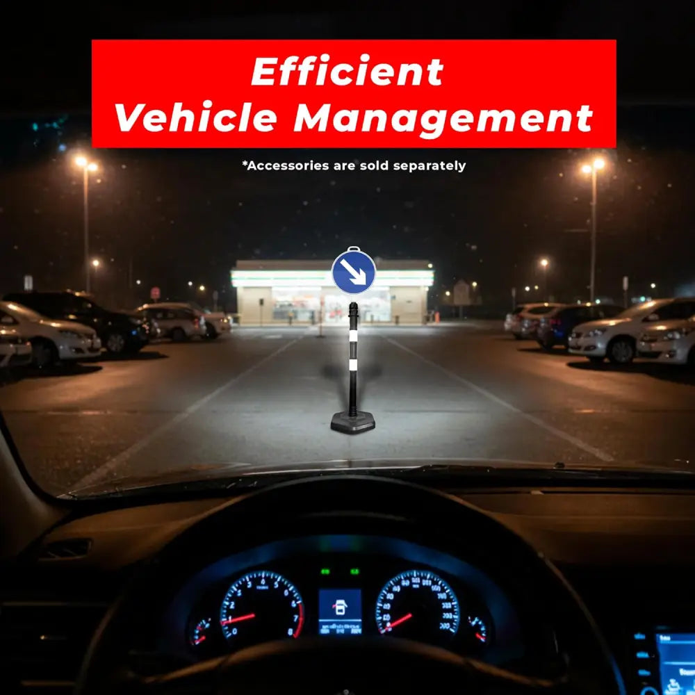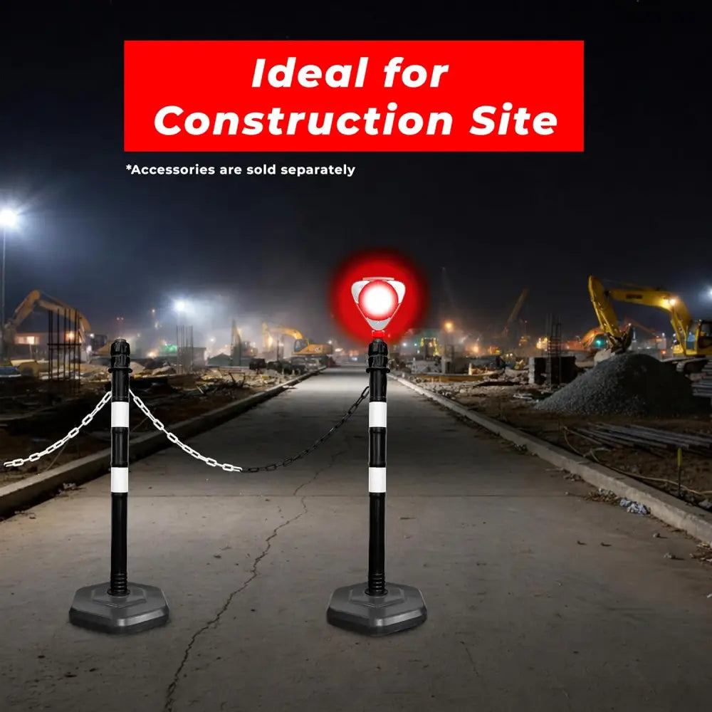 Portable 100CM Delineator Post Set includes 2 black reflective safety posts with a connecting chain, designed for temporary traffic control and parking management. Built with a demountable 3-piece structure, each post features a weighted hexagonal base for stability and a top socket for attaching sign boards. The UV-resistant black body with reflective tape ensures high visibility day and night. Ideal for parking lots, construction sites, no-parking zones, and roadside safety applications.