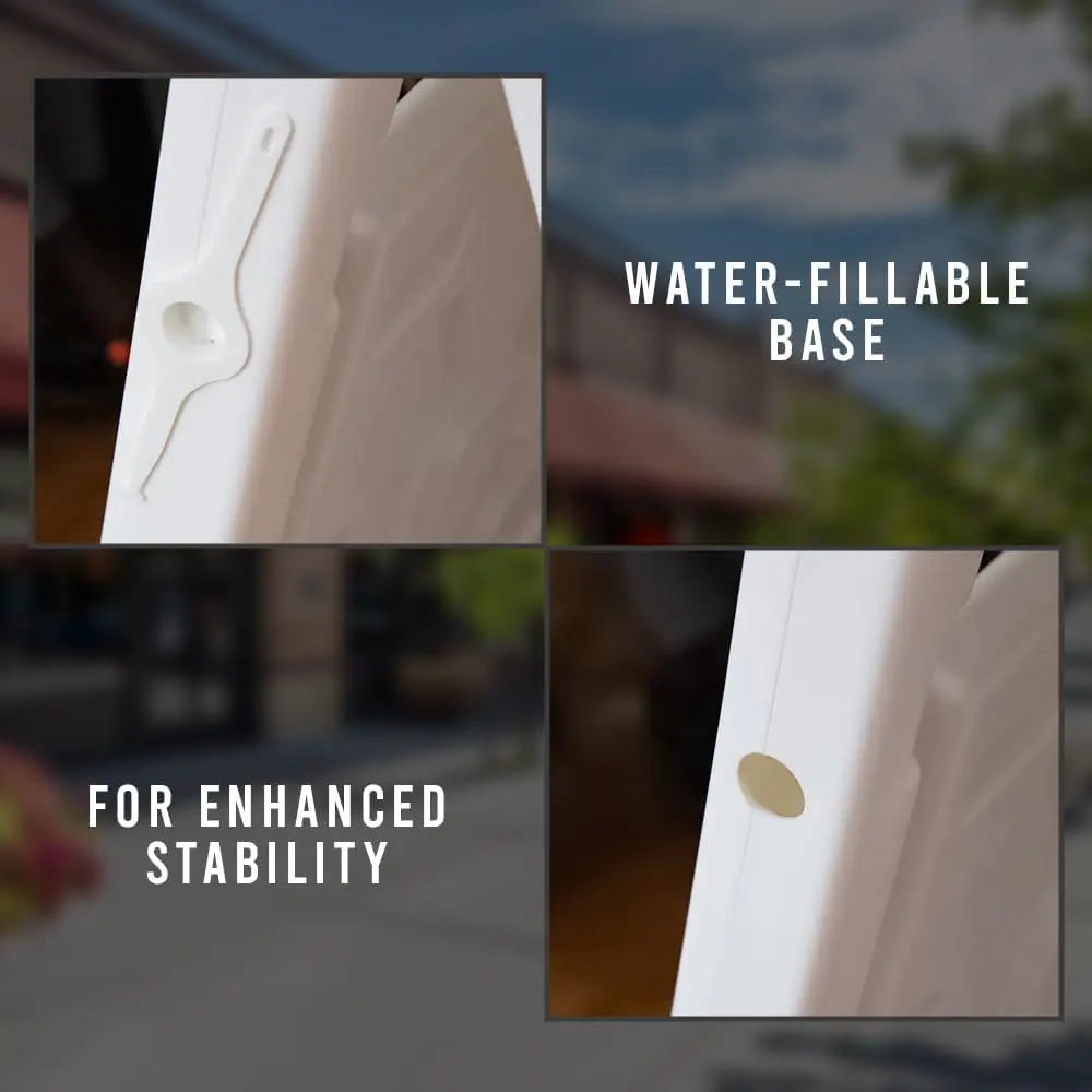Berry White A-Frame Sign Board 110x69CM combines modern design with everyday functionality. Its clean white finish ensures a professional look that highlights your posters and ads. Designed for both indoor and outdoor use, this board resists fading, cracking, and weather wear. With double-sided panels and quick-change poster slots, updating your message is effortless. The lightweight frame folds flat and includes a handle for easy transport between locations.