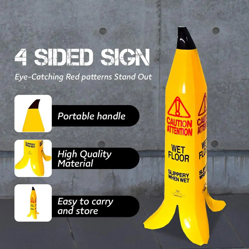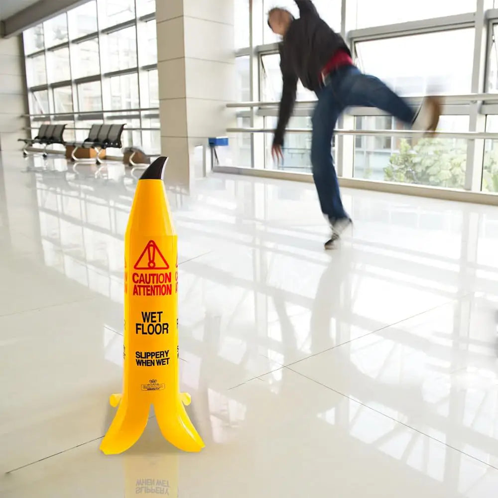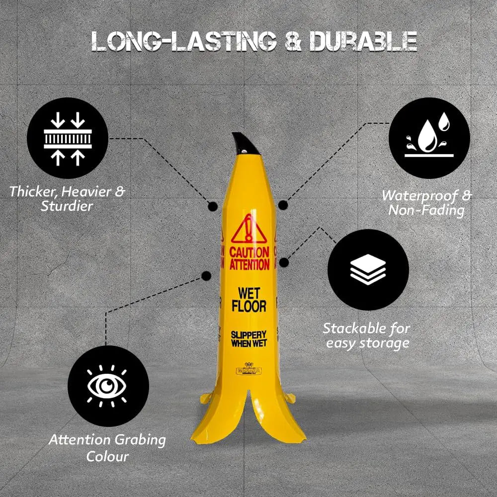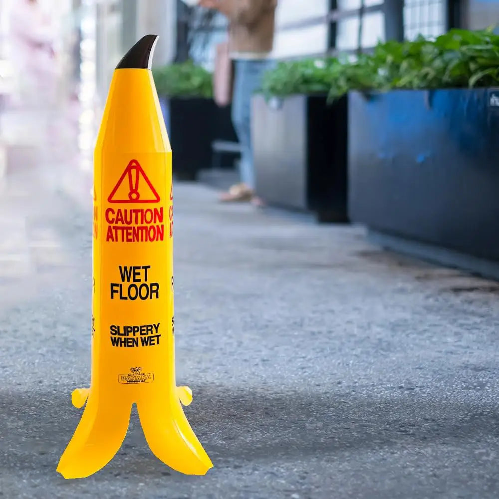 Wet Floor Banana Cone 92CM is a fun yet highly effective safety sign designed to catch attention and prevent slips. Shaped like a banana peel, it warns pedestrians of wet or slippery floors in a creative and memorable way. With collapsible storage, integrated hangers, and four rubber stoppers for stability, this sign combines humor with practicality. Perfect for malls, schools, hospitals, airports, and any public space.